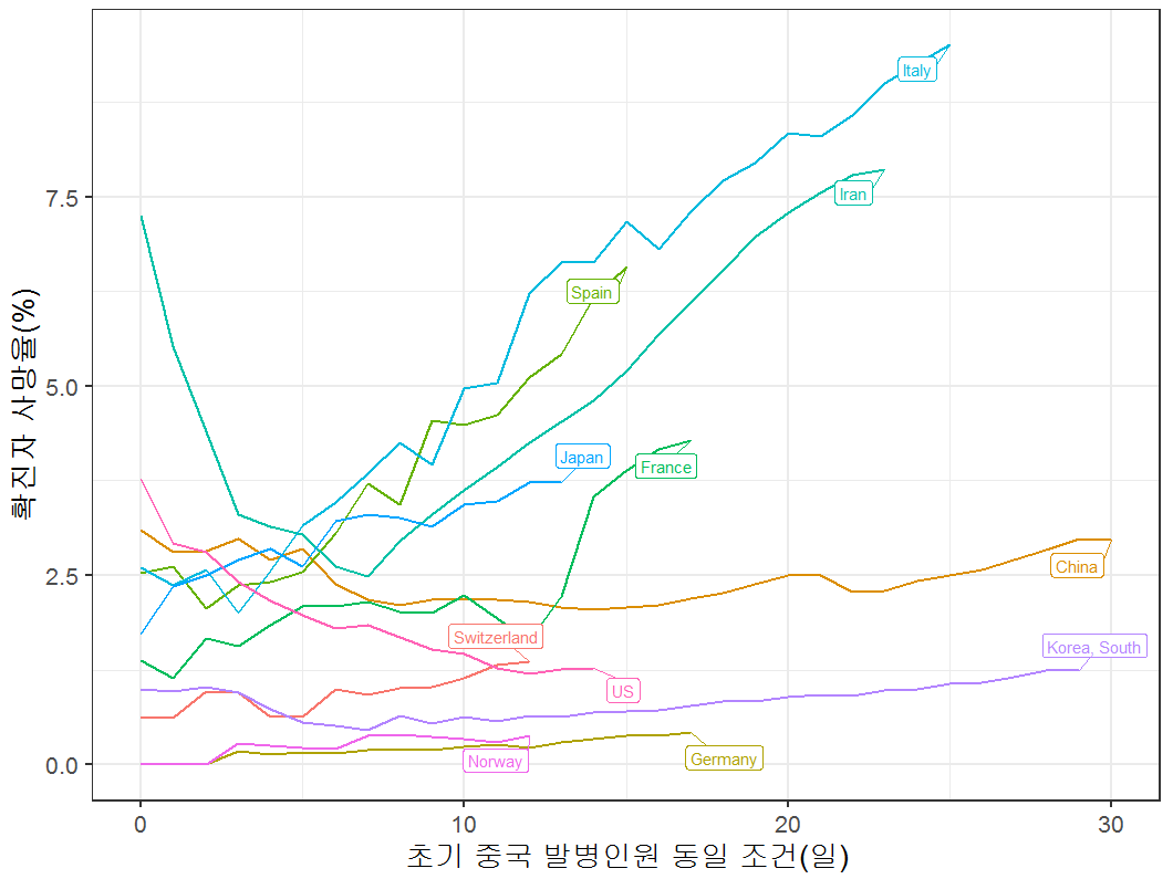 전시간에 비교한 중국 발병자 유사한 수를 base line으로 X축 기준으로 Y축 인구당 감염자 수를 비교했었다.