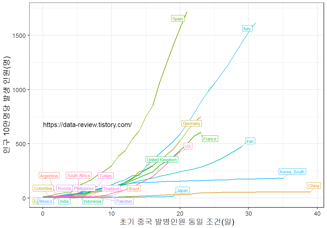 데이터를 비교할때 가장 중요하고 인사이트를 얻기 좋고 객관적으로 비교할수 있는 방법이 동일 Scale에 놓고 비교를 하는것이라 생각한다. 당연한 이야기지만 인구 수가 다른데 중국이 몇 십만명이 코로나 바이러..