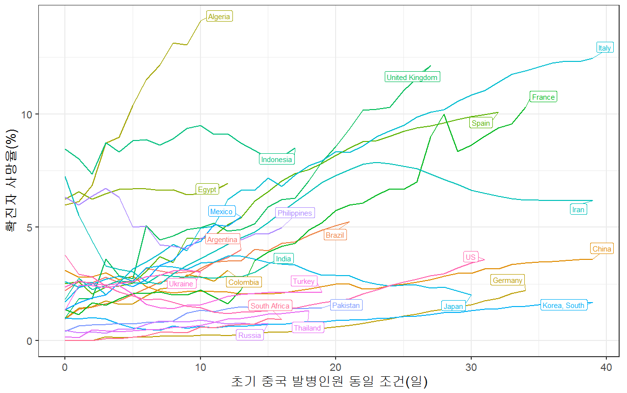 확실한것은 날씨가 더운곳, 섬나라등은 온도가 높고 습한나라는 감염자 상승 곡선이 급격하게 바뀌는 부분이 없이 일정하게 유지되는 부분으로 보아 확실히 연관이 있는것으로 보이며 이전에 언급한 불주사 관련 연관성도 여전히 유효 한거 같다. 고온 다습하지 않은 이란, 러시아의 case가 생각보다 감염 인원 증가속도가 선두를 달리는 서구권 국가 보다 낮은부분이 아마도 불주사의 영향은 아닐까 추측해본다.