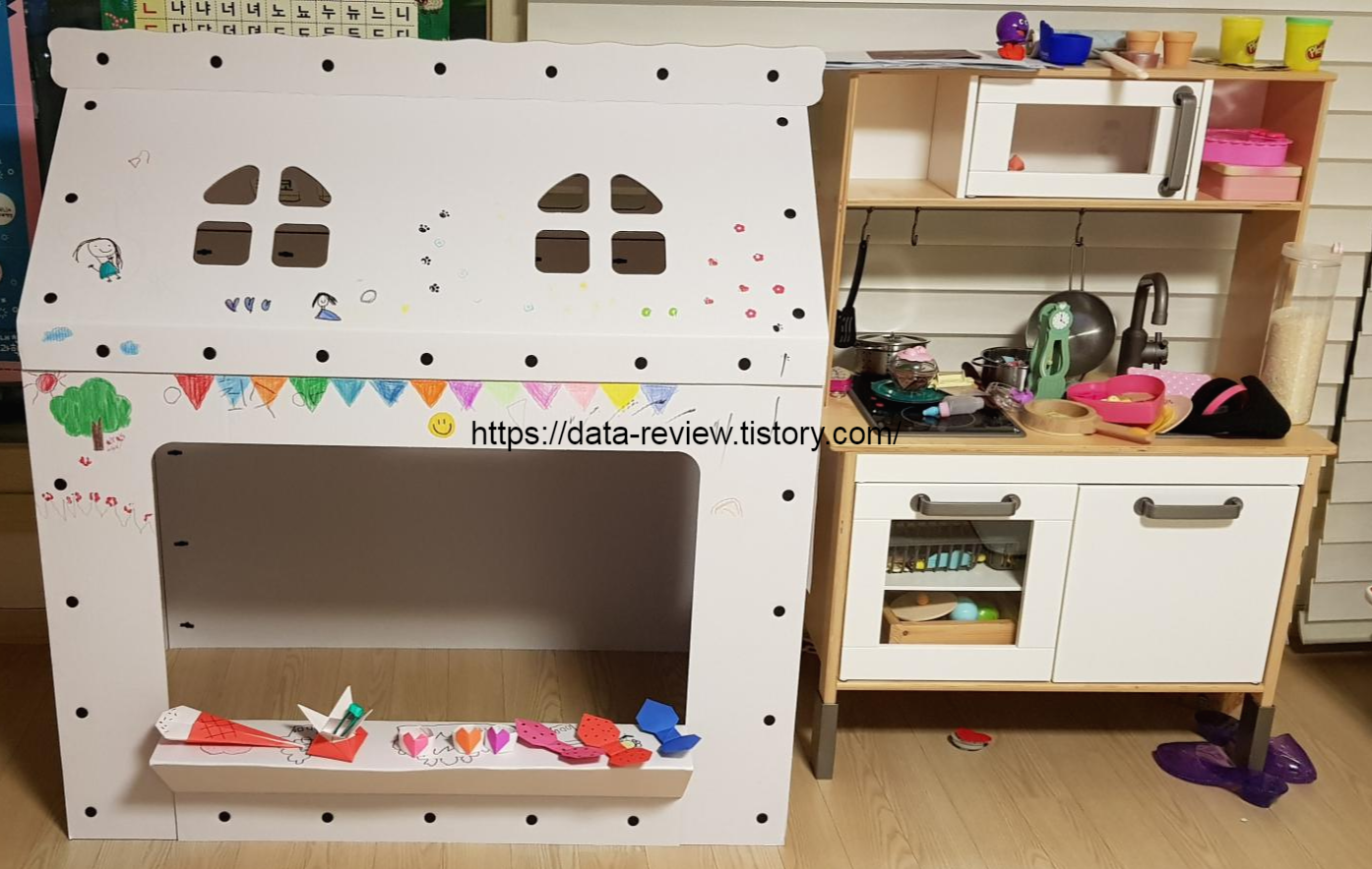 이걸.. 뭐하러.. 하는생각에 어이 없었지만.. 그래도 한번 믿어보자는 생각에.. 별말 없이 있엇는데... 회사 갔다가 오니 와이프가 휴가때 열심히 만들었다.. 그리고 이게 그냥 아무 모양이 없는 종이라서 애가 낙서도하고 그림도 신나게 그릴수 있었다. 와이프 말로는 엄청 엄청 좋아 했다고... 여기에 않아서 밥까지.. 먹었을라나..