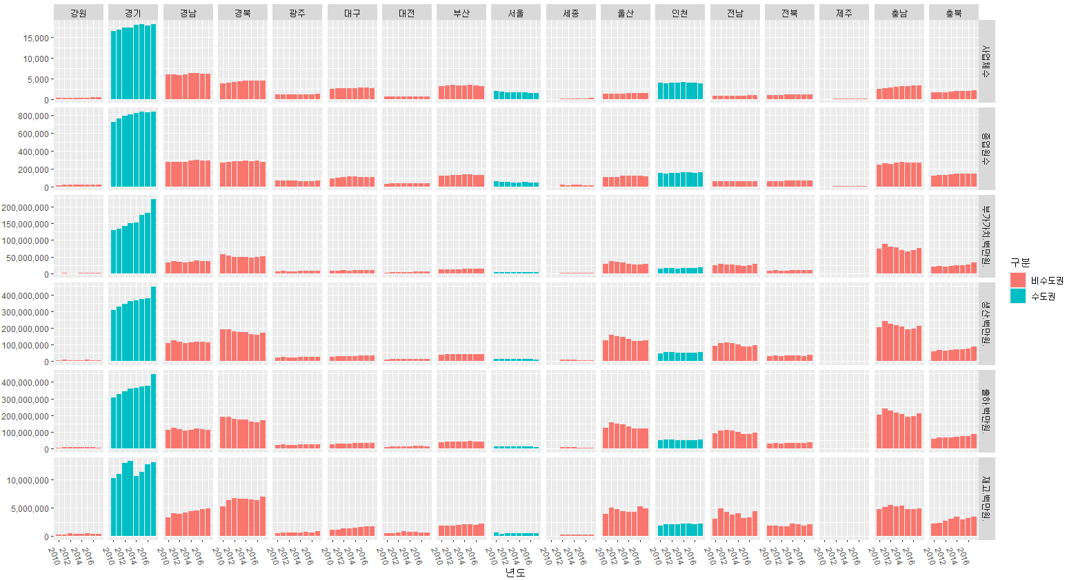 결론은 지방은 크게 차이는 없고 경기도에 증가세는 뚜렸하다. 종업원수나 업체수는 증가하는 부분이 별로 없다. 결국 한국의 제조업은 정체 되고 있다는것을 몸소 보여주는 부분이다.다만 지방과 경기도에서 확연히 차이가 나는 부분은 바로 부가가치 부분이다. 경기도만 유일하게 증가하는 방향이다. 결국 이는 고부가가치 제조업이 여기에 몰려있다는 말이다.